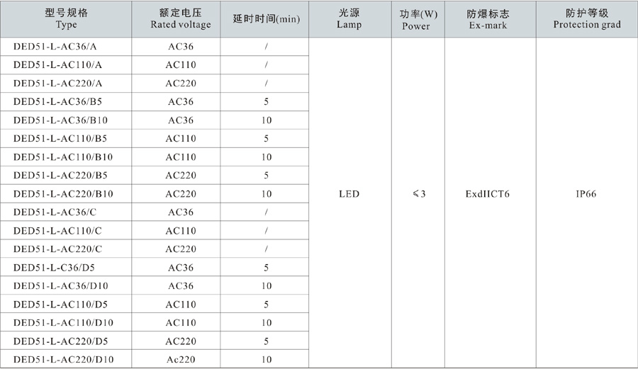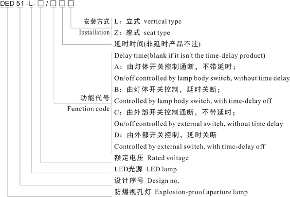 2. Please specify clearly for special requirements on rated voltage.    e.g: if need a vertically installed DED51-LED explosion-proof inspection hole lamp, rated voltage is AC110, with lamp body switch control, turn off after a delay of 5min, then the order model should be DED51-LED-AC110/B5L.